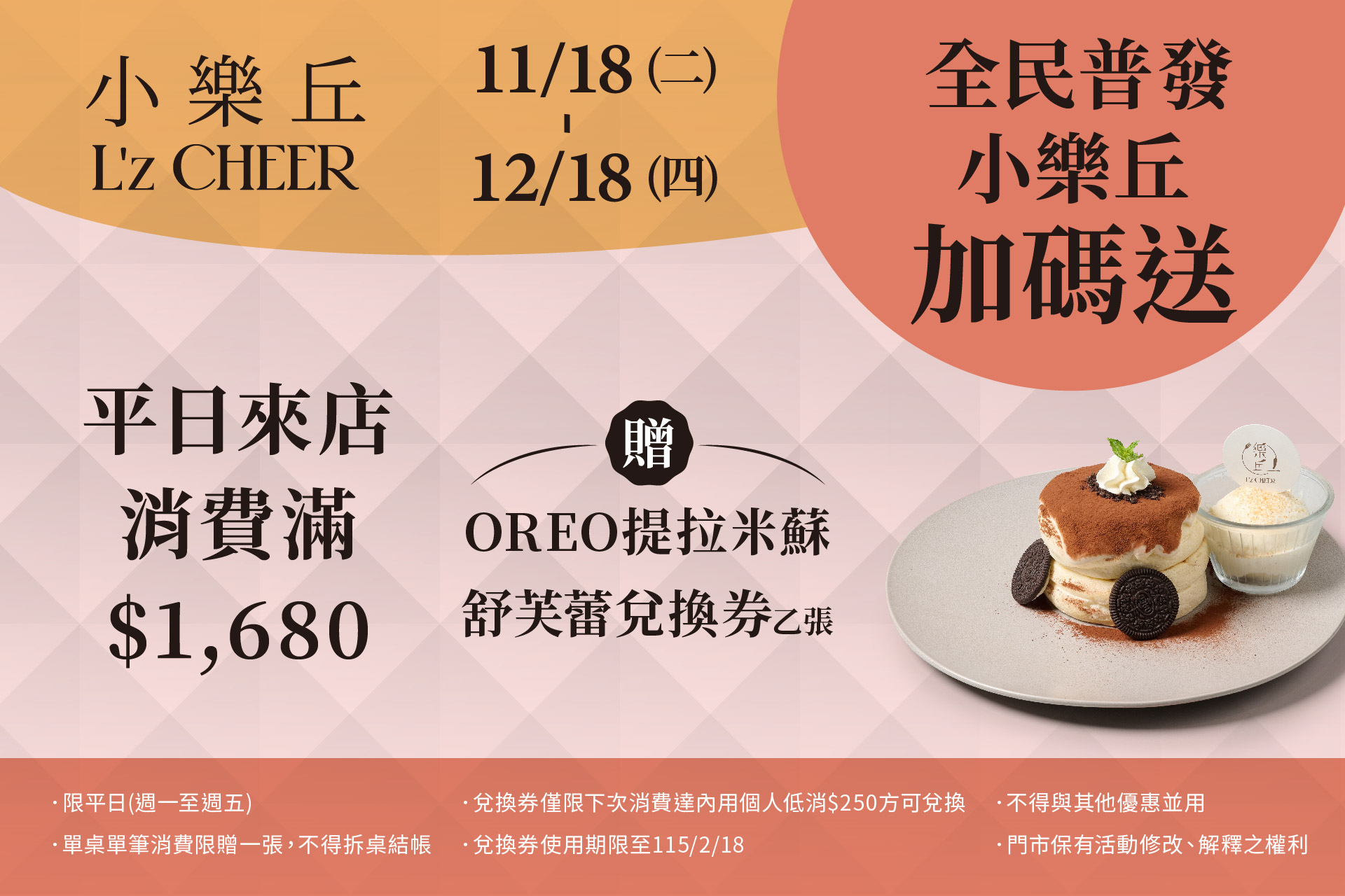 於活動期間內平日來店消費滿$1,680,贈OREO提拉米蘇舒芙蕾兌換券乙張(價值$180)